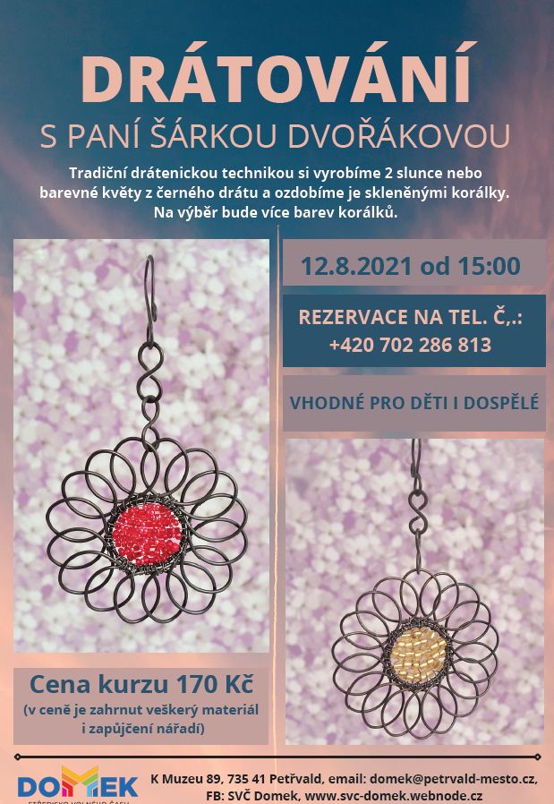 DOMEK, 12.8.2021, od 15:00 hod., Tradiční drátenickou technikou si vyrobíme 2 slunce nebo barevné květy z černého drátu a ozdobíme je skleněnými korálky.