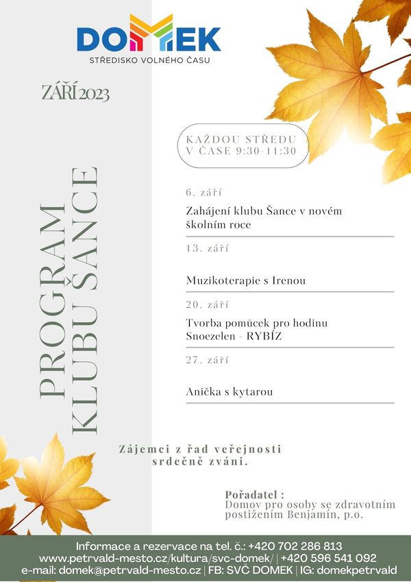 Klub šance SVČ Domek, 6., 13., 20., 27.9.2023, akce Domova pro osoby se zdravotním postižením Benjamín, p.o.